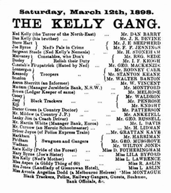 The Kelly Gang is a 1896 Australian play about Ned Kelly by actor Reg Rede. Heavily influenced by the stage adaptation of Robbery Under Arms, in which Rede had appeared, the play was immensely popular and often imitated by other authors writing about Ned Kelly. It should not be confused with The Kelly Gang by Arnold Denham. Denham’s play likely plagiarised Rede’s, but due to the lack of copyright protection at the time, Denham faced no consequences. The play debuted in rural regions in 1896 and then moved to Melbourne two years later. It gained significant popularity and, unlike an earlier production about Kelly, Ostracised, was not banned. This factor led to numerous imitations, many of which borrowed from Rede’s play and Robbery Under Arms.